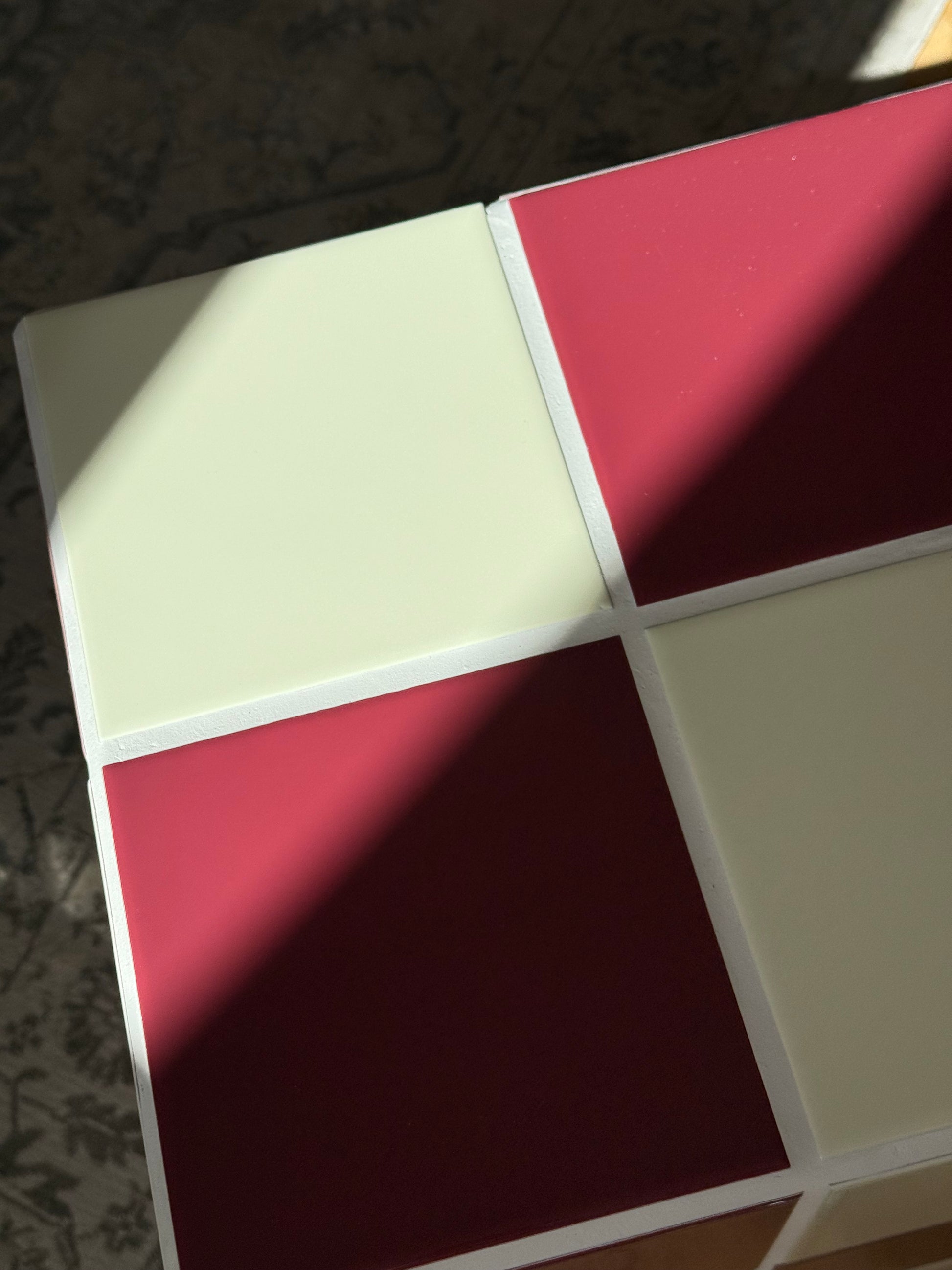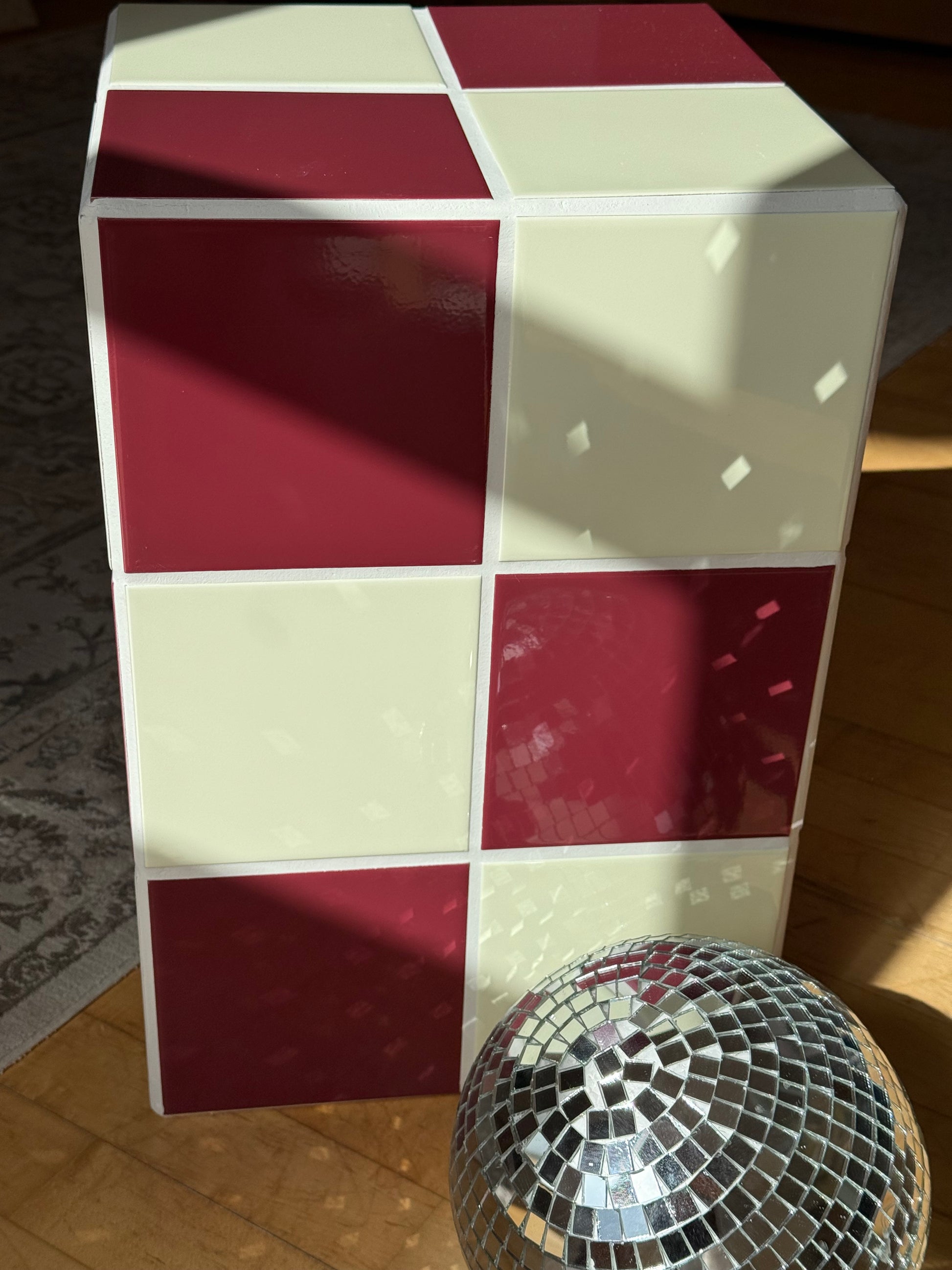 Dieser handgefertigte Kacheltisch im charmanten 80er-Jahre-Look vereint modernes Design mit einem Hauch Nostalgie. Die glänzenden Fliesen treffen auf sanfte Fugen – ein echter Eyecatcher für jedes Interior.